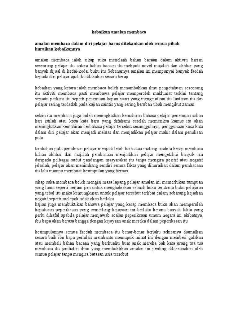 FAEDAH MEMBACA Faedah-faedah Amalan Membaca Membaca adalah salah satu amalan yang amat. Isi Kepentingan menyertai kokurikulum di sekolah. Hebat sangat karangan tentang kebaikan amalan membaca itusaya sangat menyukainyaterima kasih kerana telah menunjukkan contoh karangan itu.
